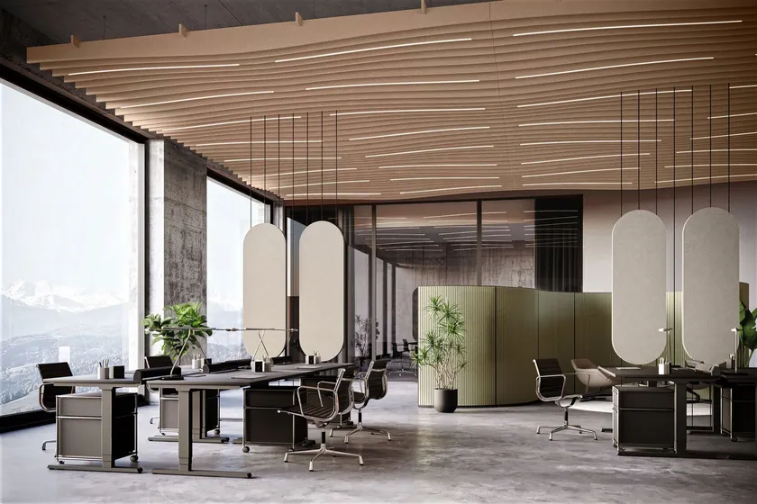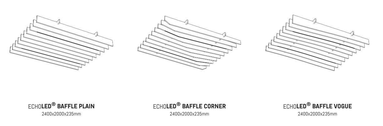 EchoLED® BAFFLE je ideálním řešením pro prostory, kde je vyžadována funkční vyváženost a designová čistota. Spojením precizního technického výkonu a ekologické odpovědnosti proměňují tyto akustické panely stropy v inspirativní architektonické prvky. K dispozici je i verze EchoBAFFLE® bez osvětlení.