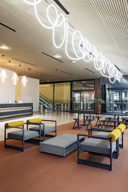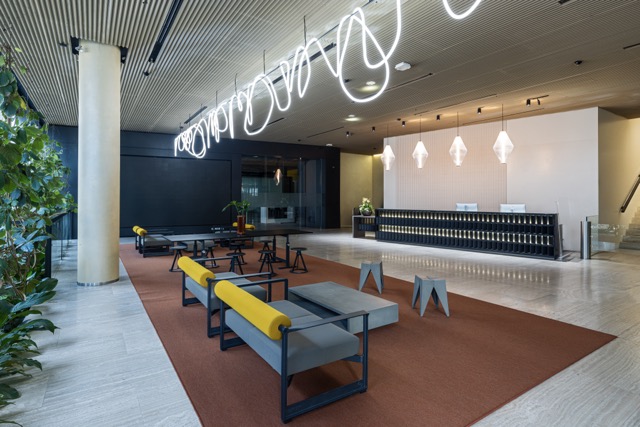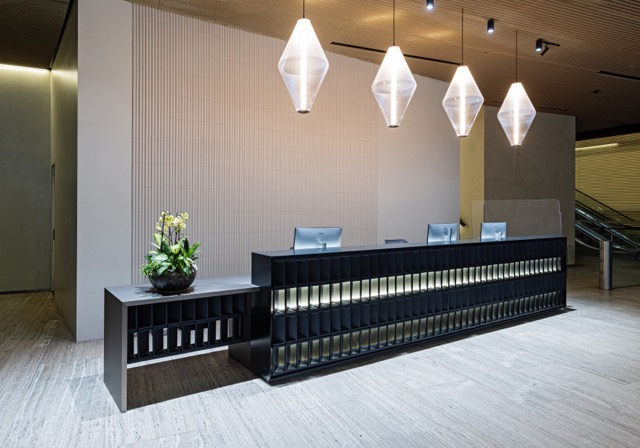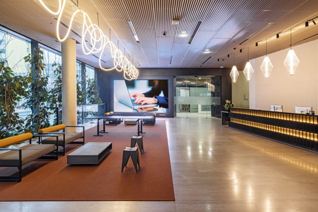 Pro řešení rekonstrukce recepce a vstupních prostor do budovy jedné z nejznámějších globálních IT firem jsme byli přizváni, abychom pomohli se popasovat s požadavky nejvyšších evropských protipožárních norem v únikových zónách. Na recepci jsou zakomponovány dle přání zadavatele výškově stavitelné stoly HermanMiller RATIO s možností využití i pro hendikepované či invalidní uživatele a pohodlné ergonomické pracovní židle COSM. Ve vybavení dominuje kov - kovové stoličky Knoll PITON a od značky Magis také kolekce BRUT, kterou v roce 2017 navrhl německý designér Konstantin Grcic, je oceňována pro své netradiční využití litiny. Název "Brut" odkazuje jak na surovost a hmotnost materiálu, tak na ušlechtilost šumivého vína, což se odráží v kontrastu mezi masivními průmyslovými základy a jemným čalouněním či deskami stolů.