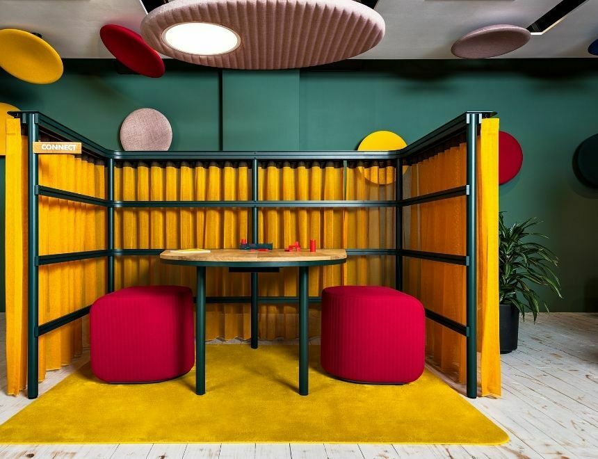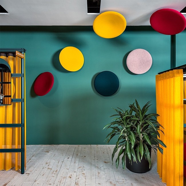 Playful exterior, complex interior. This high-performance acoustic wall and ceiling treatment marries design and function with the recognizable shape, reminiscent of a satellite dish. BuzziDish is unique for its playful, rebellious character and distinct appearance. Experiment with colors to match other furnishings, and emphasize its playful personality with the added option of customizing a bicolor design.