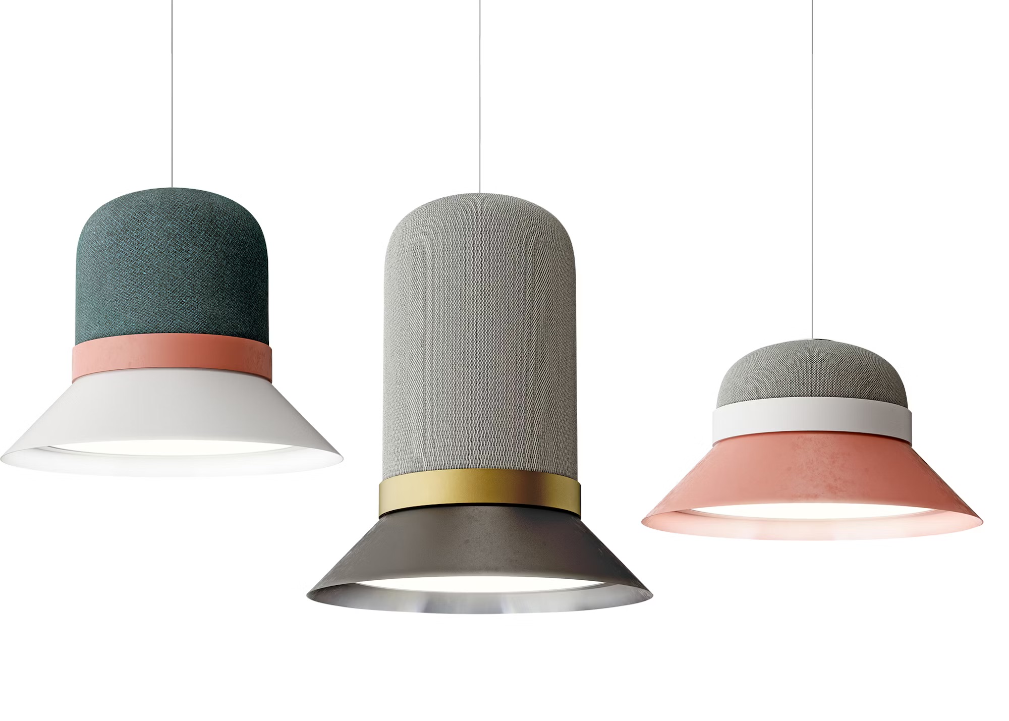 Create your own unique BuzziHat by choosing from 4 sizes, 4 metal shades, 4 metal ring colors, and 375 fabrics. Mix-and-match finishes fitting other furniture in the same space whether office, hospitality or lobby settings. Different sizes absorb more or less sound. The bottom hides all electrical components, while the top part acts as a high performant sound-absorbing element. Combine different sizes of BuzziHats for the ideal acoustic solution.