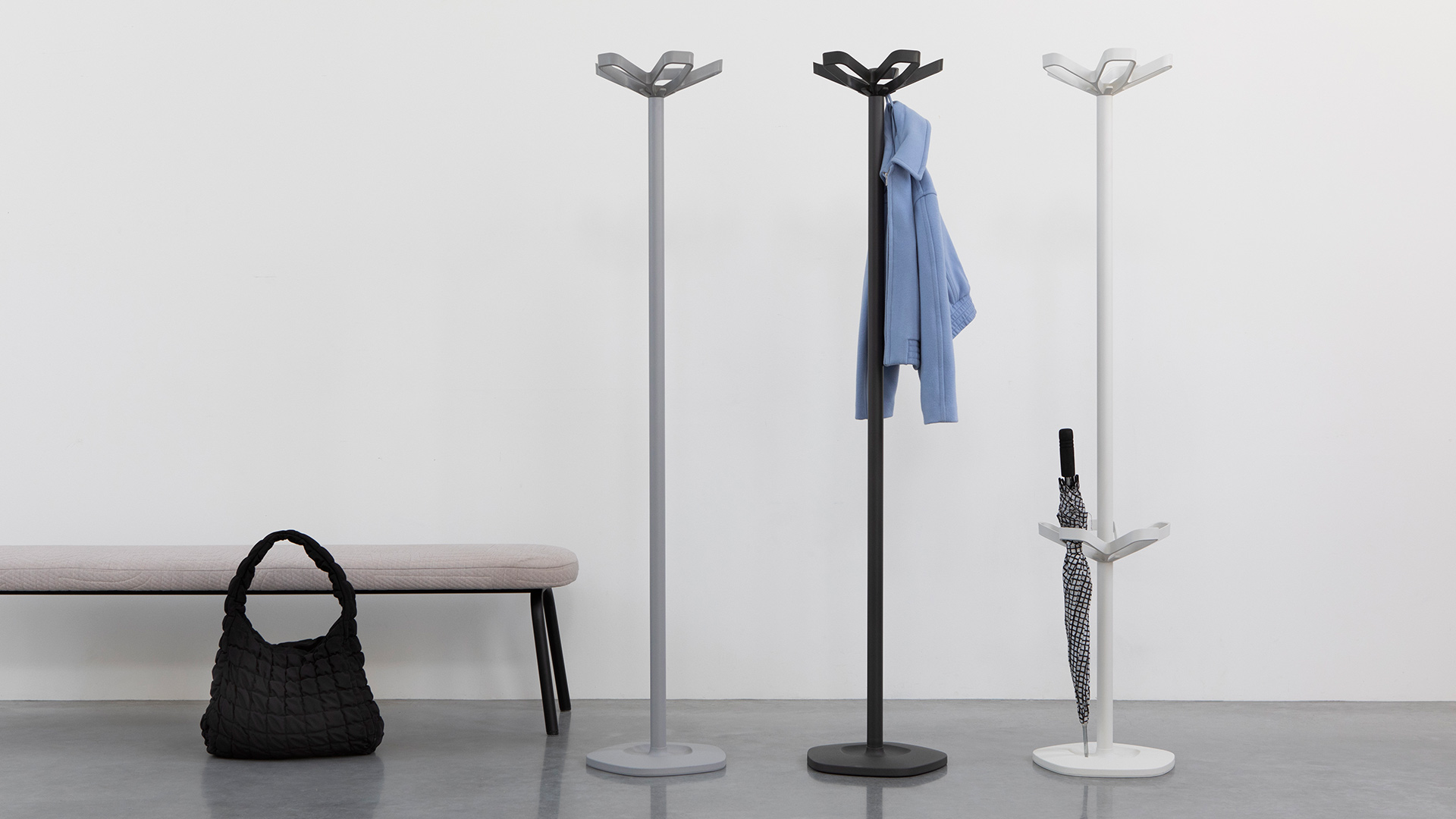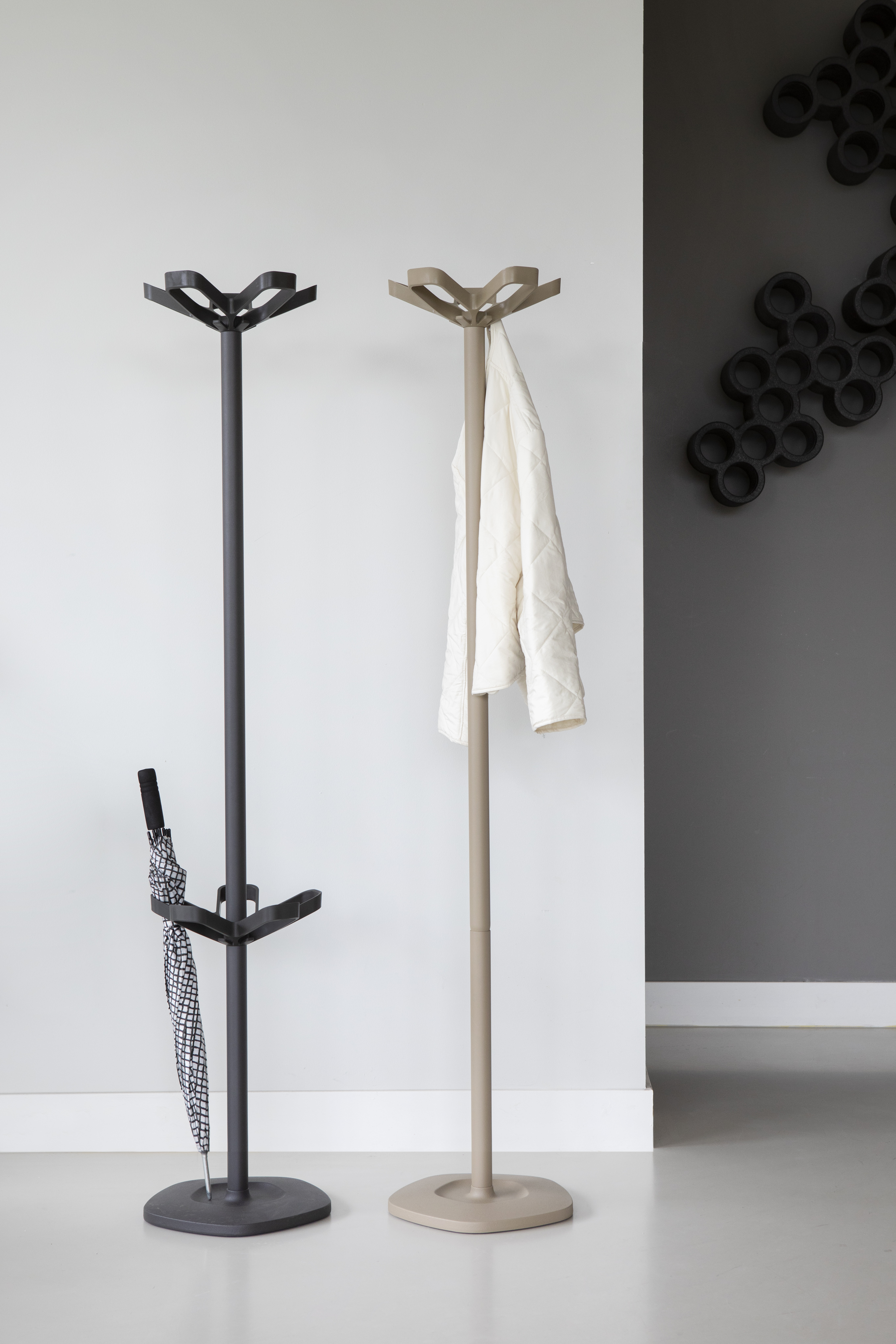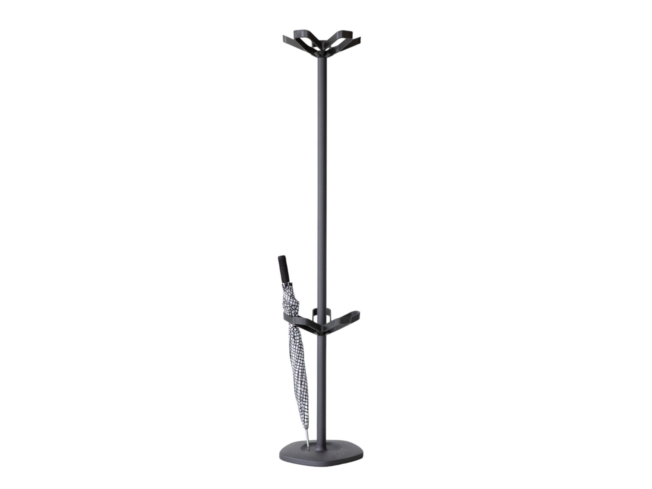 The prime characteristic of Flower is the beautifully lined wardrobe crown. Making sure that the coat rack will accommodate at least ten coats. The heavy cast iron base ensures optimal stability. Flower is available in two versions: with or without an integrated umbrella holder, while eight contemporary colours offer plenty of choice.