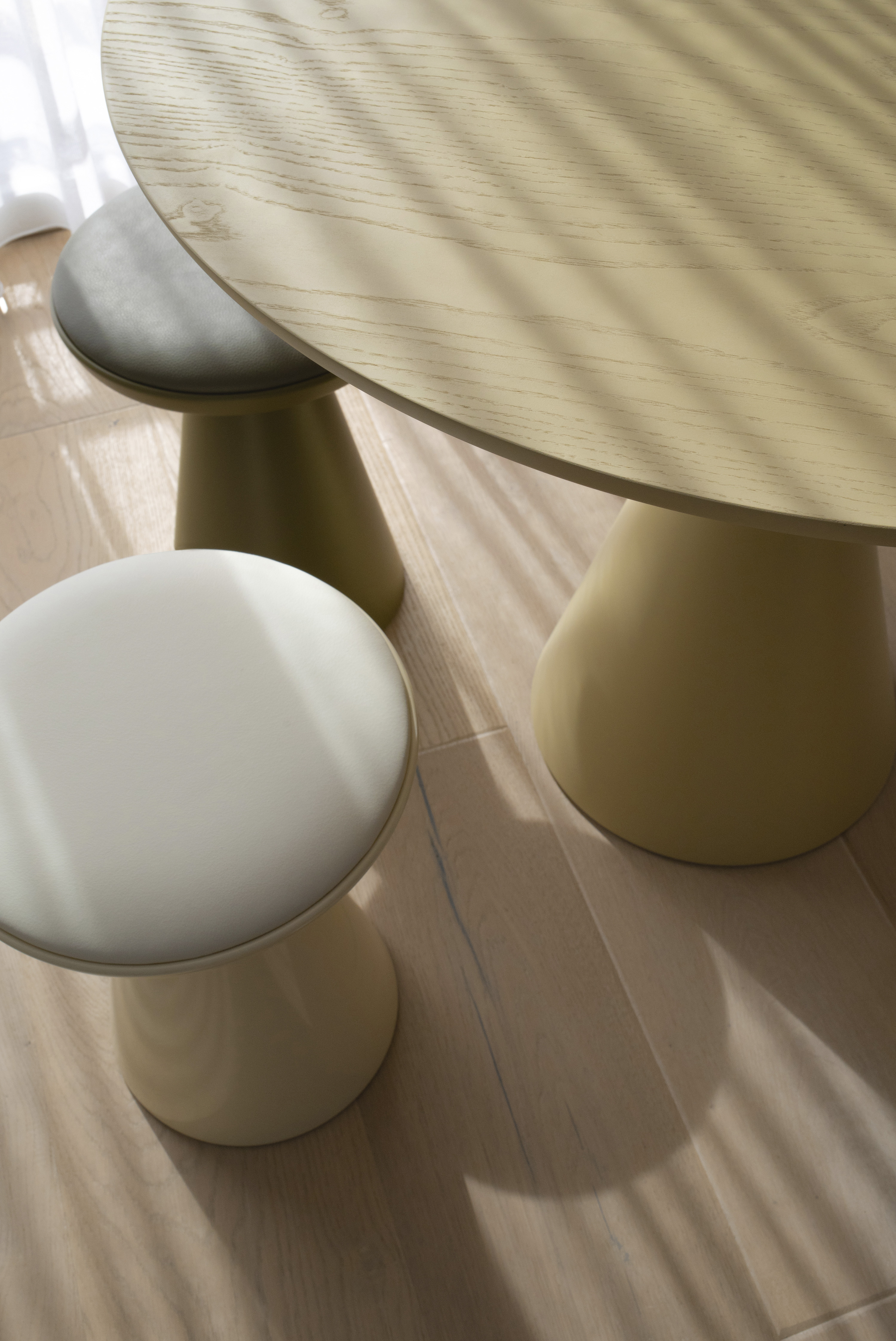 The Pion is a complete set of pieces. The queens and kings are represented by the dining and conference tables. Flexible enough to be used in a range of situations, from a meeting room to a restaurant or living room, they command attention wherever they are placed. Rooks, bishops and knights can all find their analogies within a legion of occasional tables. And yet, the humble pawn, the stool, should not be overlooked. Small and robust, its leather seat has been carefully tanned to match the colour of the lacquered base.