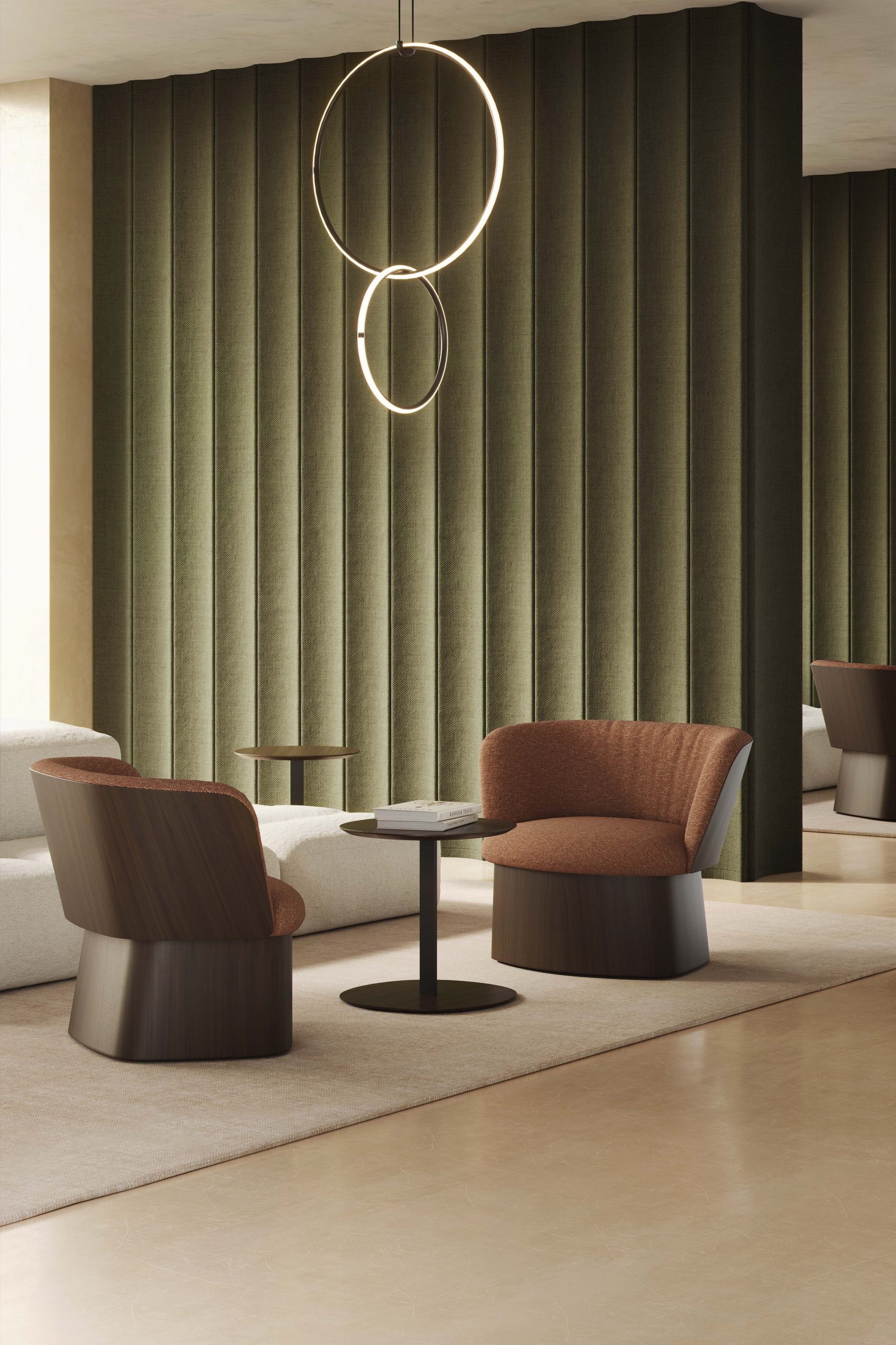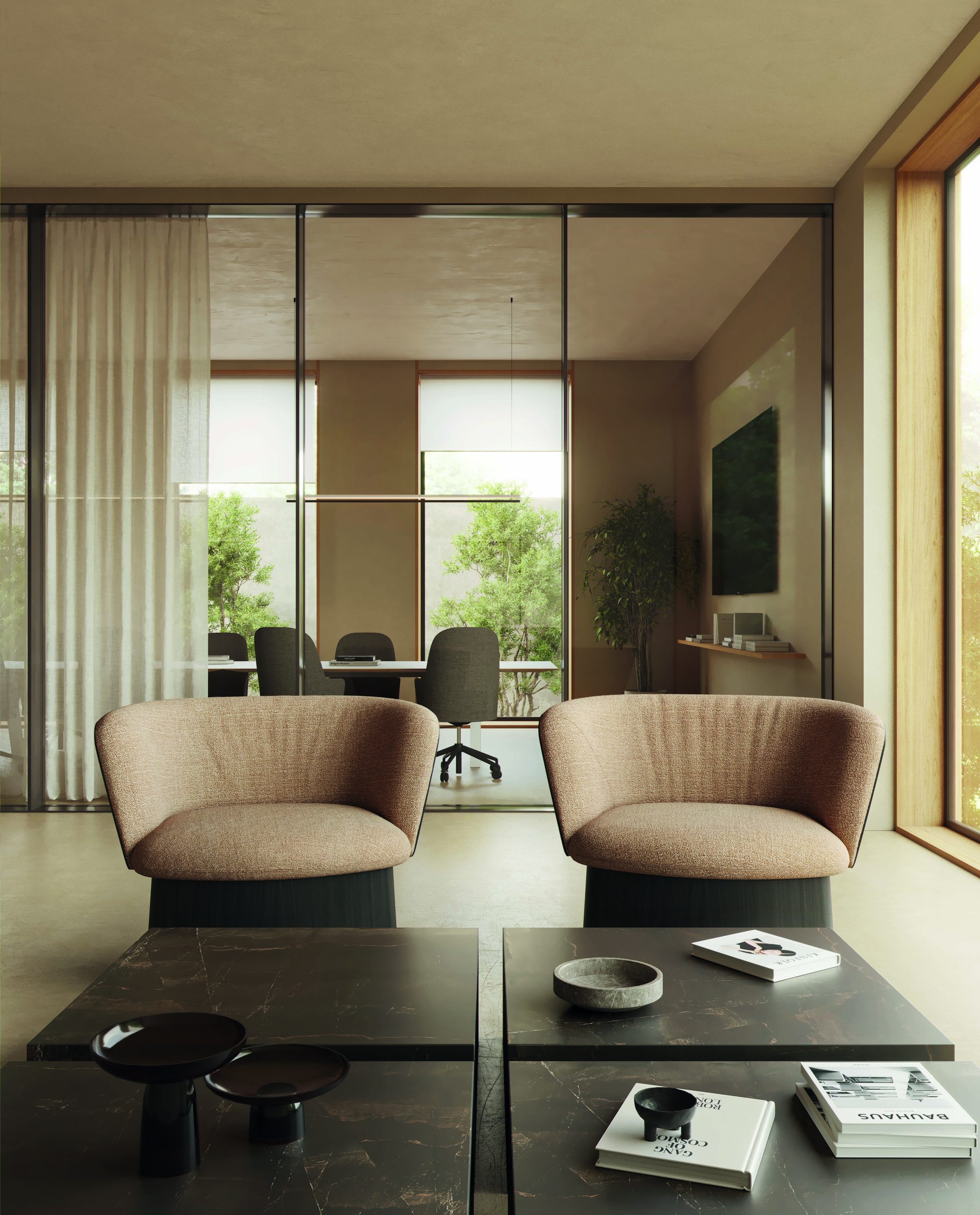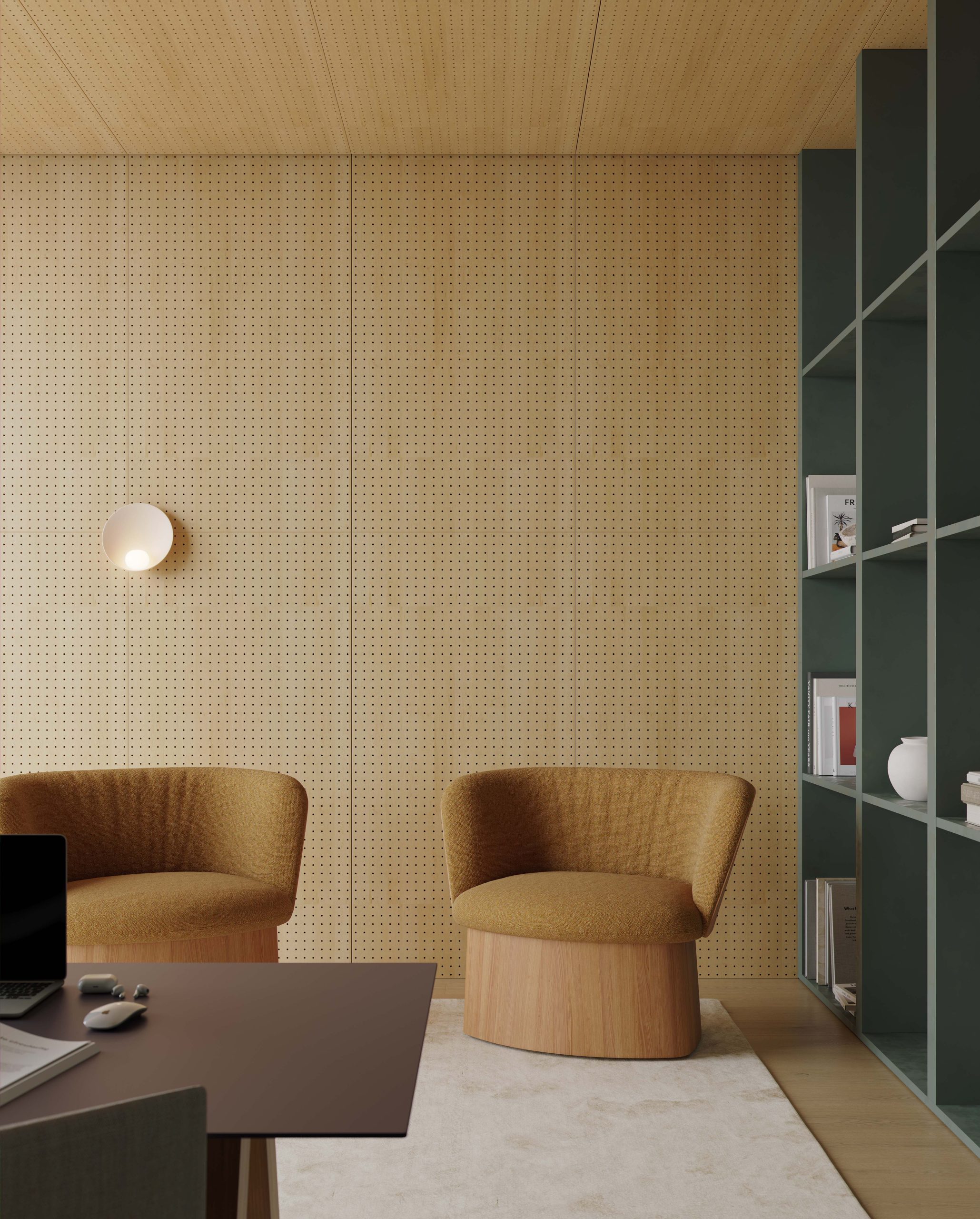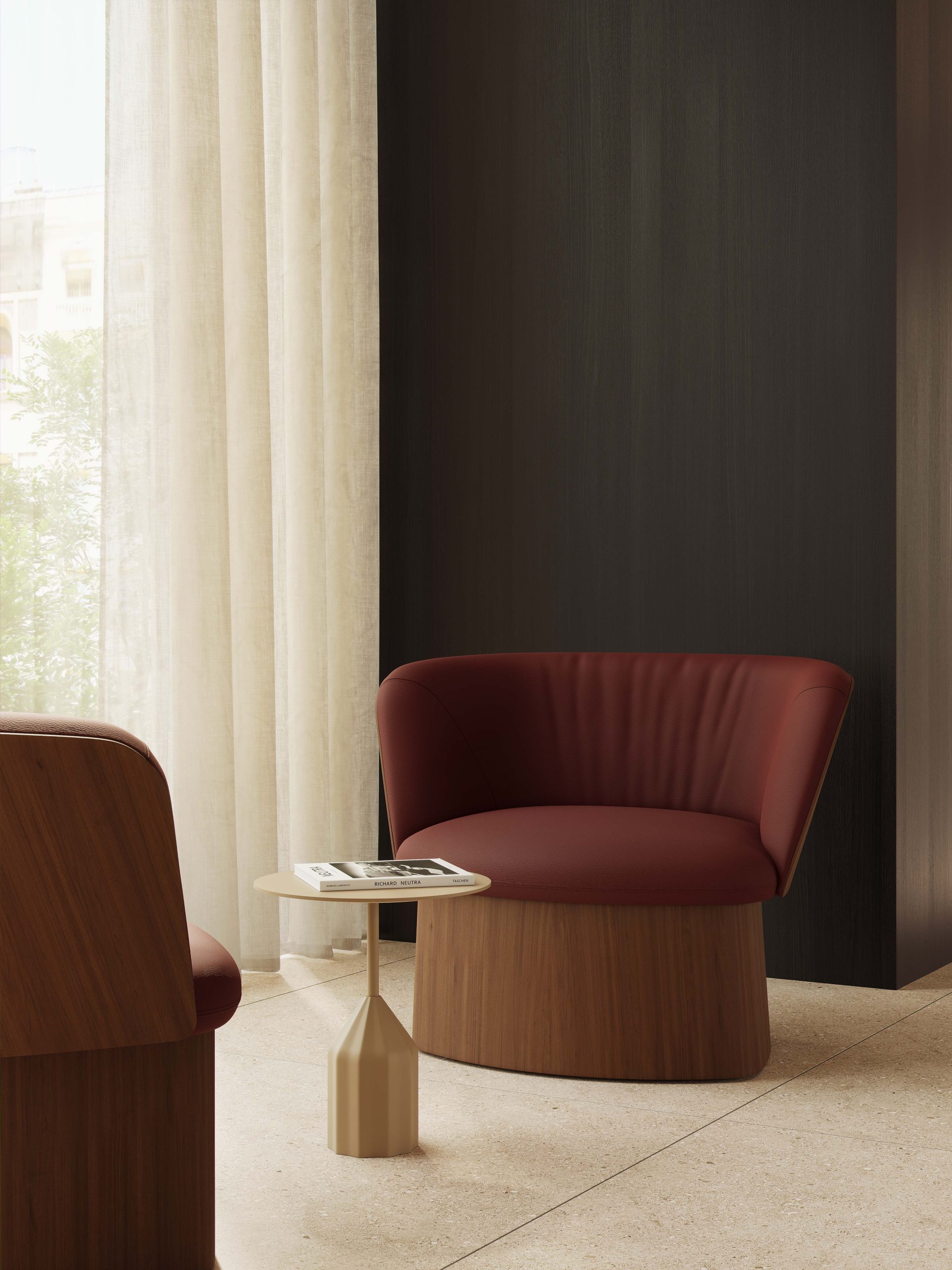 The rounded backrest contrasts with the clean lines of the base, creating harmonious proportions and a striking presence. Thanks to the combination of wood and upholstery, Manto integrates seamlessly into receptions, cafés, and offices, as well as home interiors.