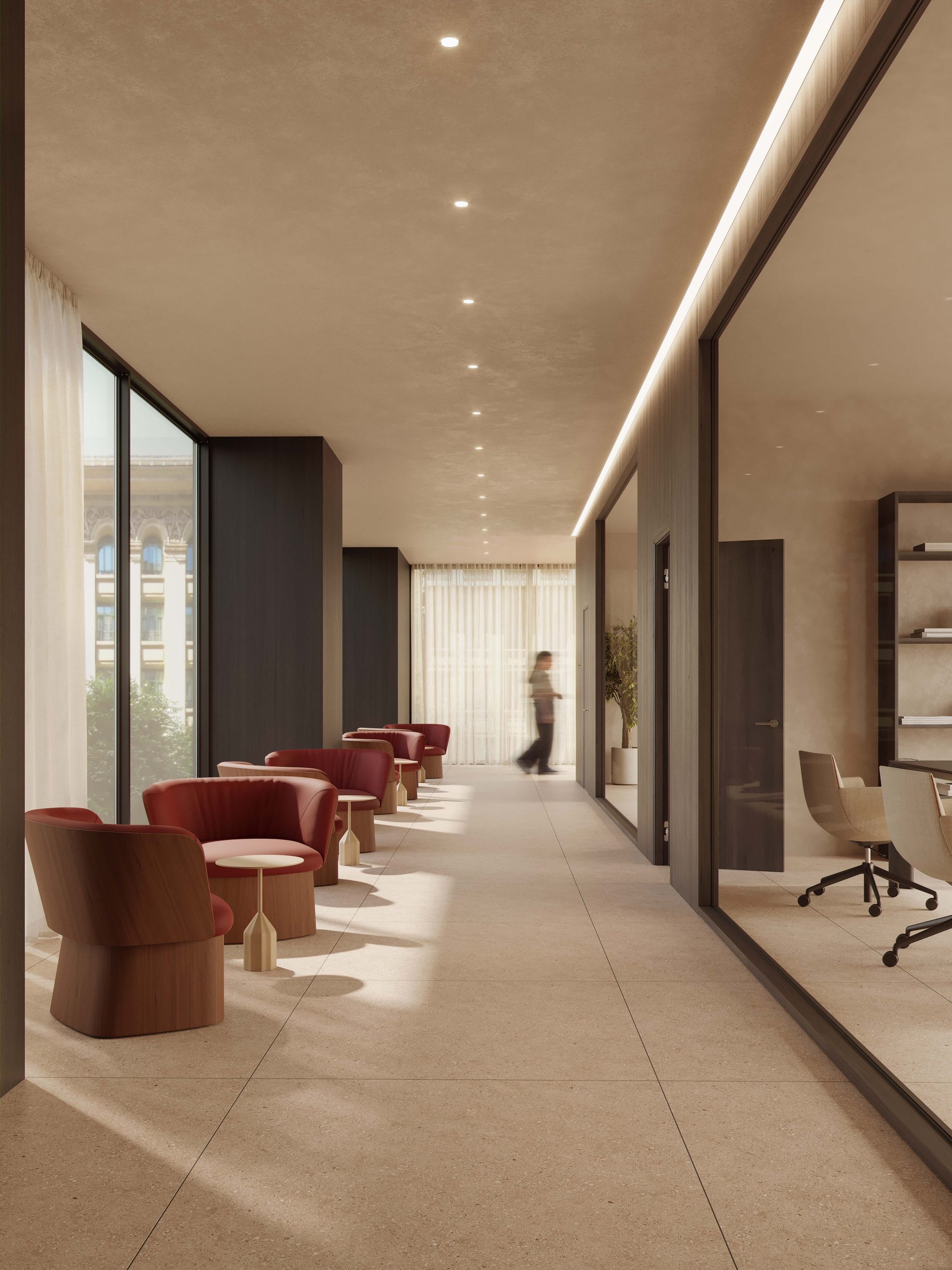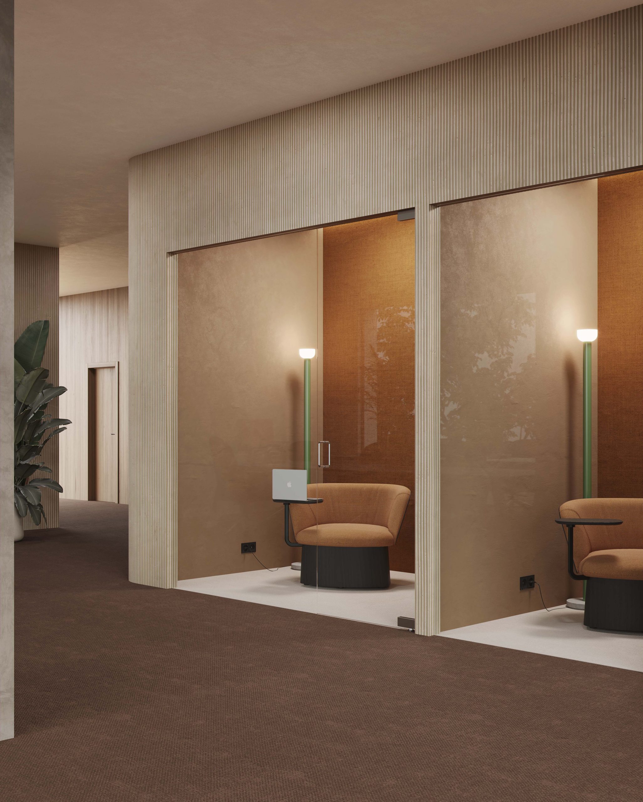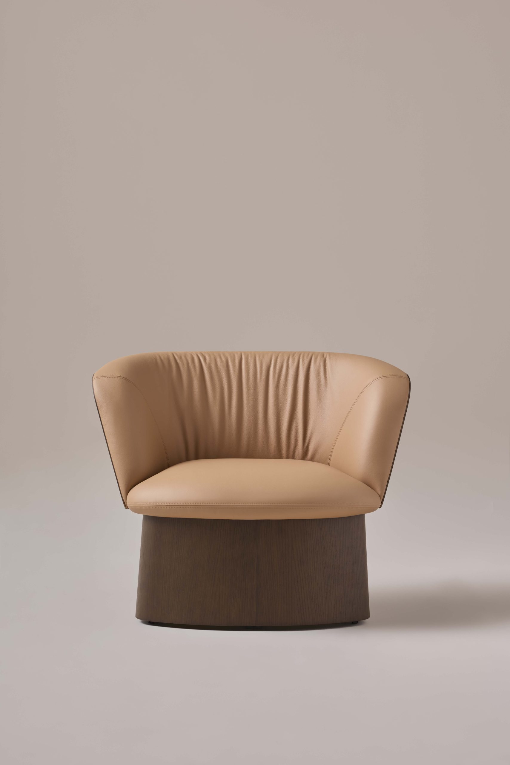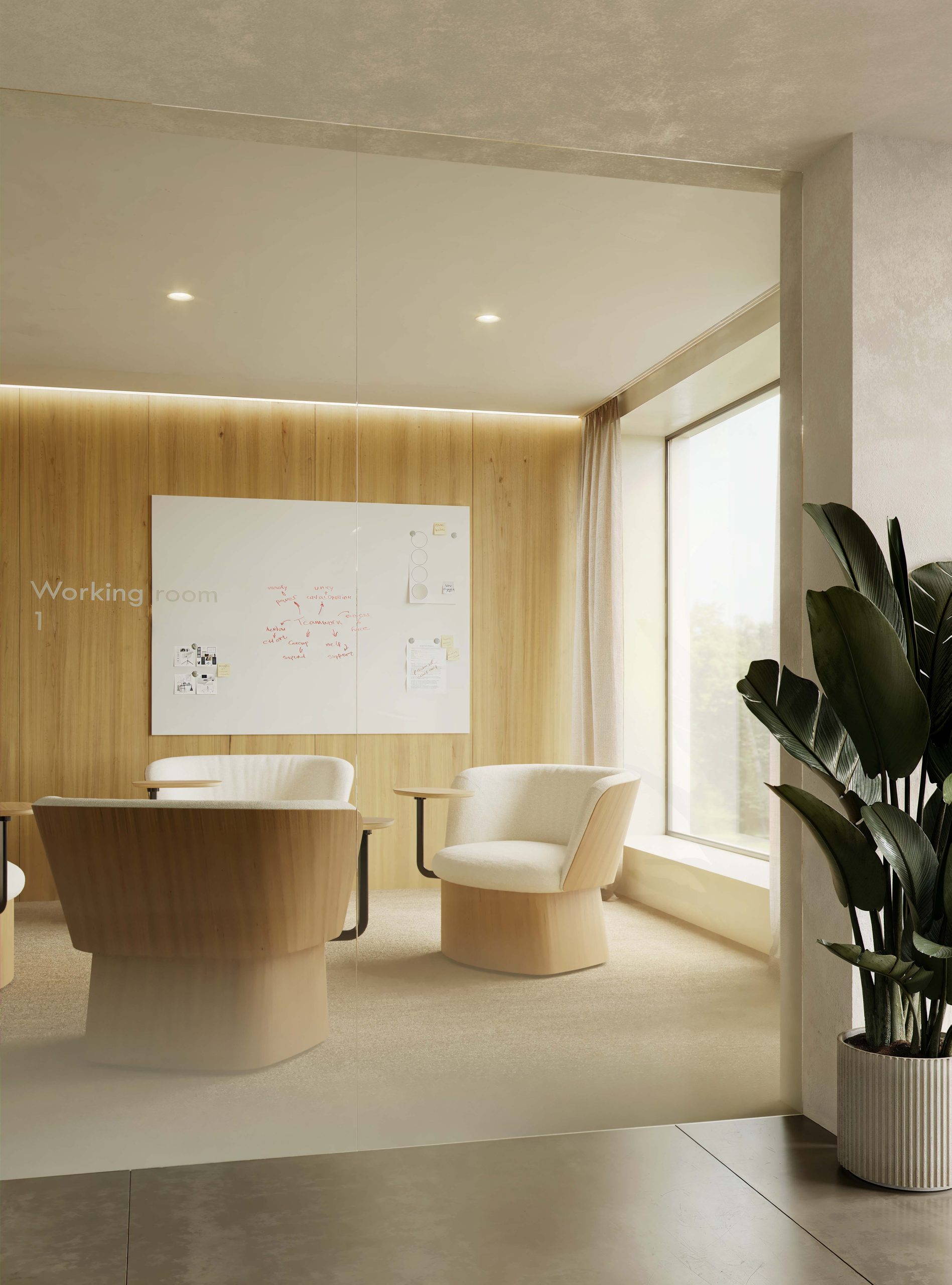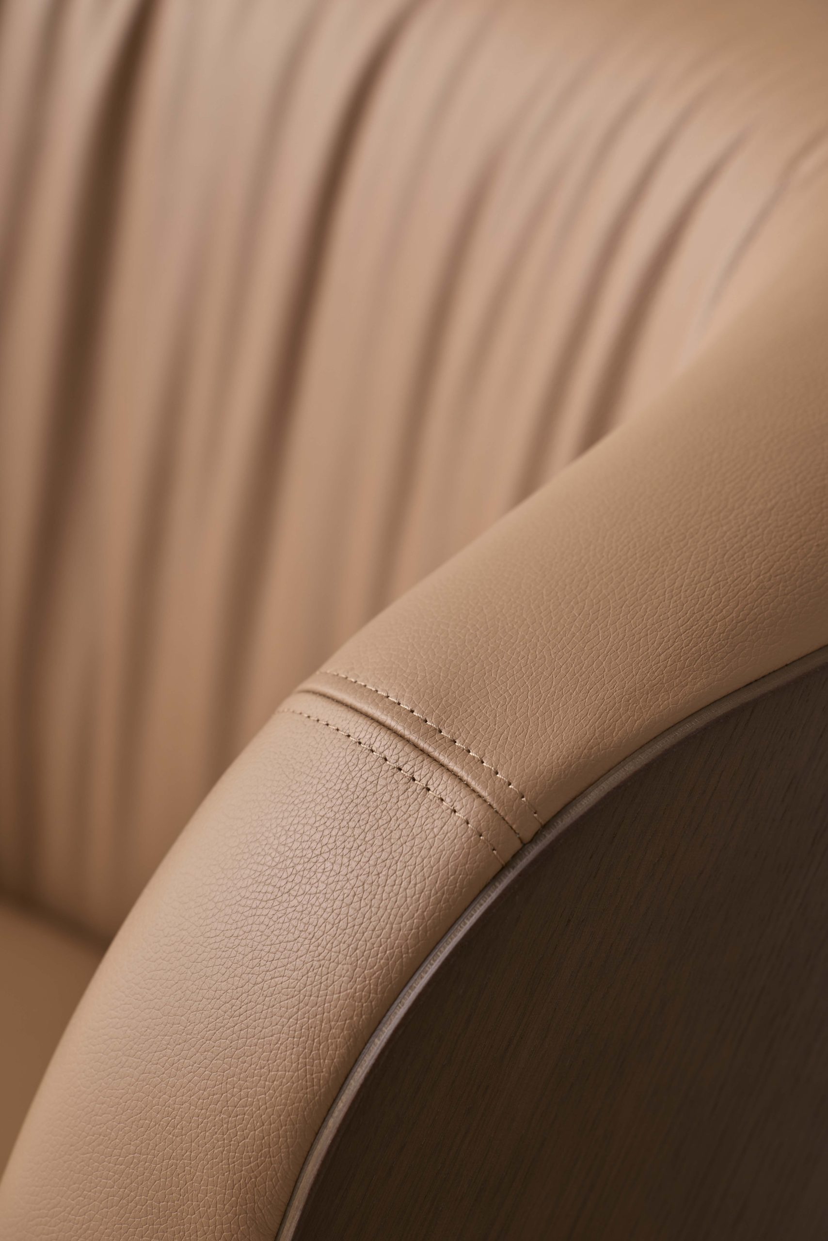 The rounded backrest contrasts with the clean lines of the base, creating harmonious proportions and a striking presence. Thanks to the combination of wood and upholstery, Manto integrates seamlessly into receptions, cafés, and offices, as well as home interiors.