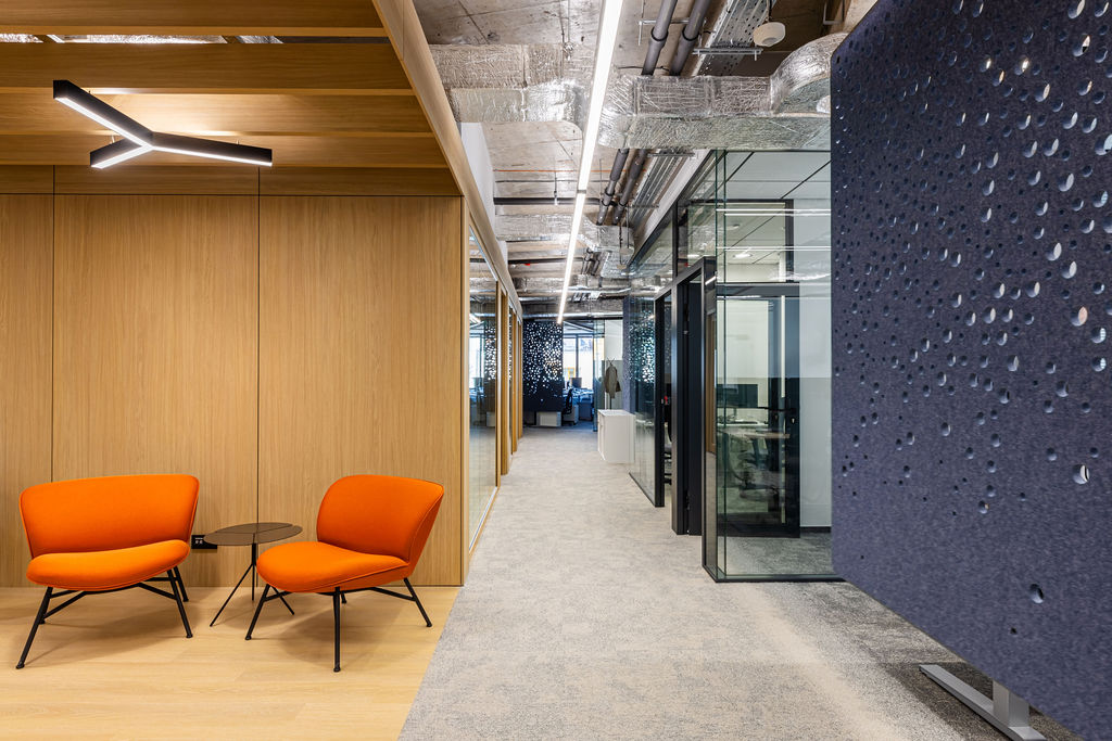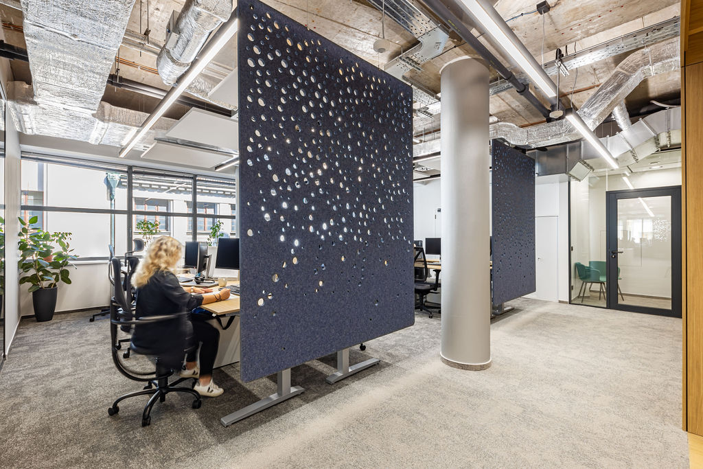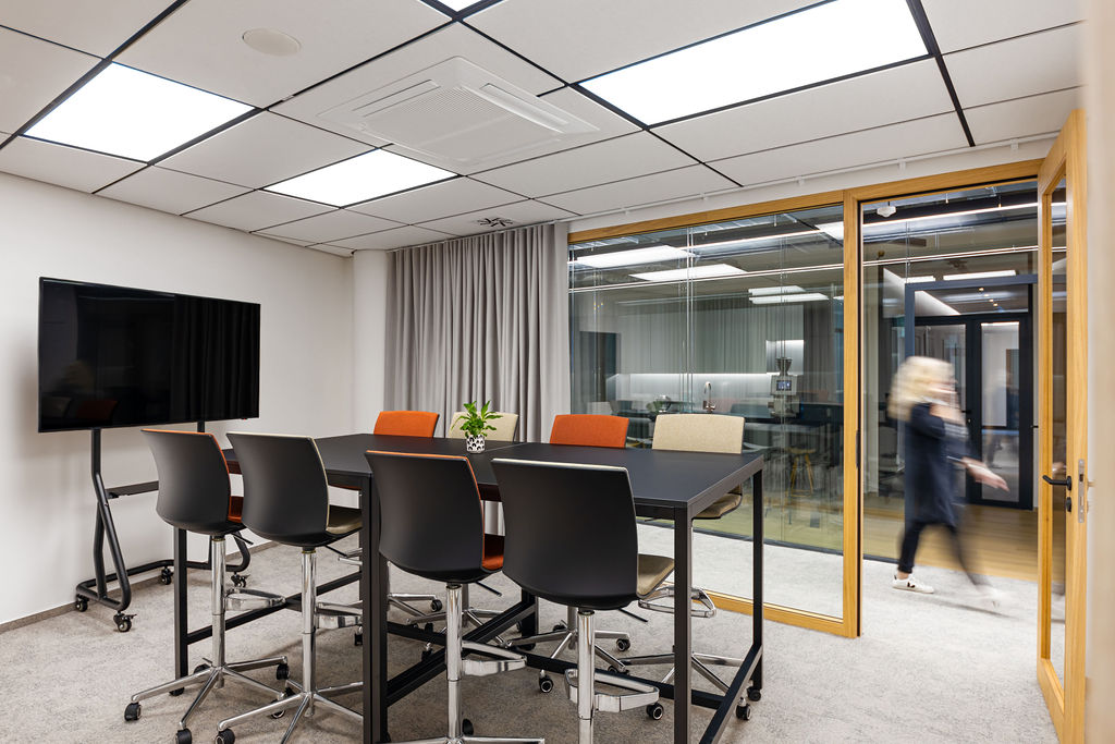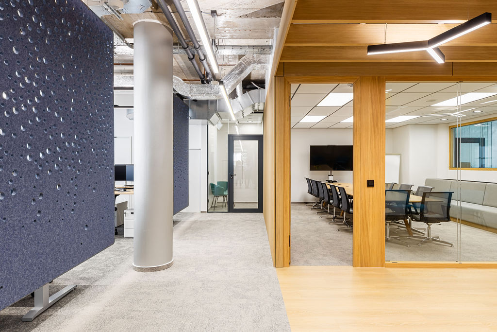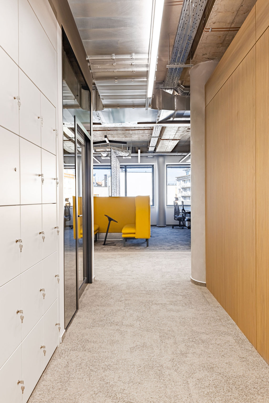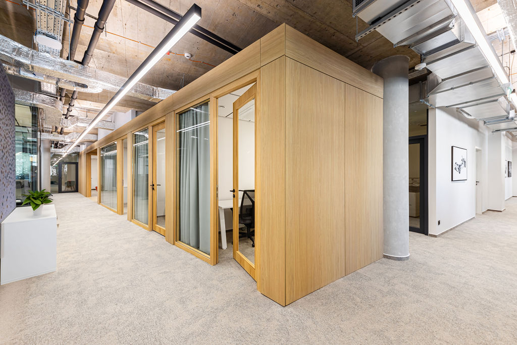 We are proud to have contributed to this project by equipping the offices with our products, helping to create a modern, ergonomic, and aesthetically refined workspace. Workstations feature height-adjustable desks from our cre8 PUZZLE line with integrated cable management, complemented by HermanMiller mobile metal pedestals. Meeting rooms are fitted with cre8 PUZZLE Endow conference tables. Acoustic comfort and visual appeal are enhanced by suspended ECHOCURTAIN panels from the Swiss company EchoJazz, manufactured from recycled PET materials. Additional acoustic benefits are provided by the REW sofa from Spanish brand Sancal. The overall interior concept is completed with LOTTUS chairs, as well as PUNTO and BURIN tables from renowned Spanish manufacturers Enea and Viccarbe.