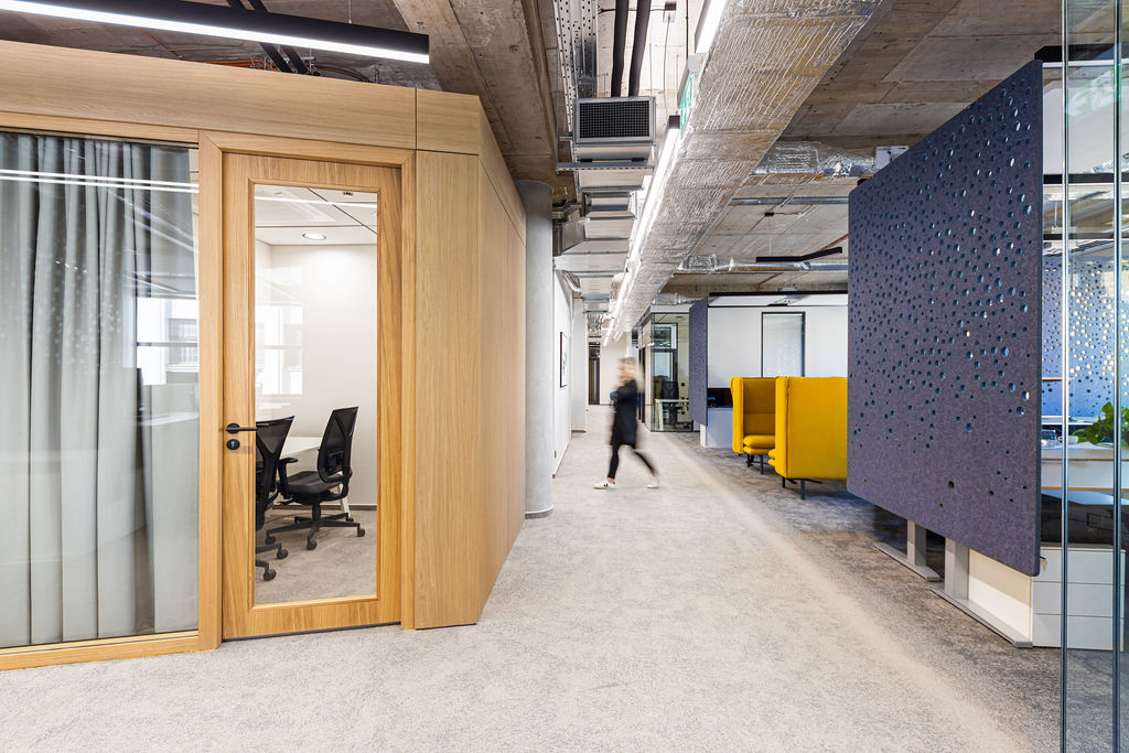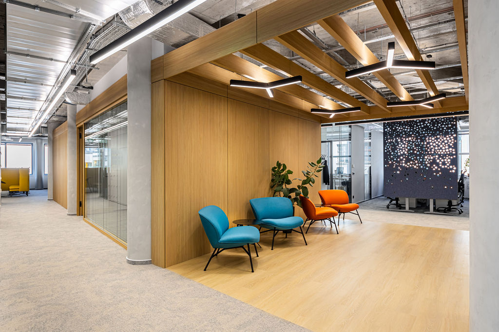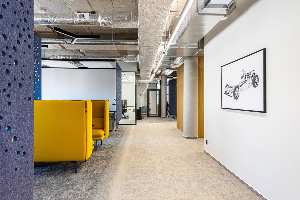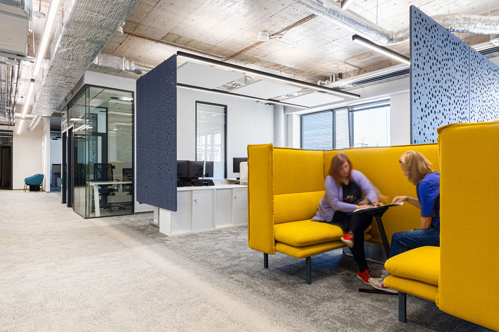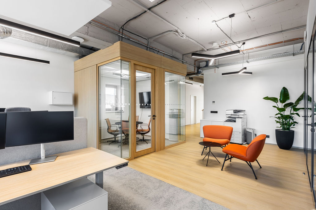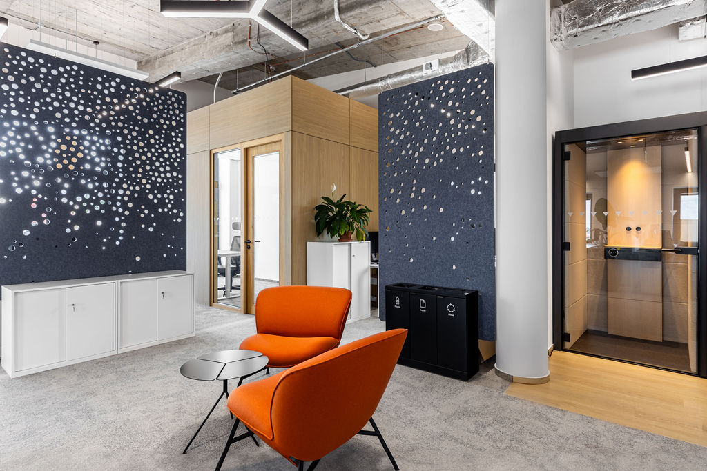 We are proud to have contributed to this project by equipping the offices with our products, helping to create a modern, ergonomic, and aesthetically refined workspace. Workstations feature height-adjustable desks from our cre8 PUZZLE line with integrated cable management, complemented by HermanMiller mobile metal pedestals. Meeting rooms are fitted with cre8 PUZZLE Endow conference tables. Acoustic comfort and visual appeal are enhanced by suspended ECHOCURTAIN panels from the Swiss company EchoJazz, manufactured from recycled PET materials. Additional acoustic benefits are provided by the REW sofa from Spanish brand Sancal. The overall interior concept is completed with LOTTUS chairs, as well as PUNTO and BURIN tables from renowned Spanish manufacturers Enea and Viccarbe.