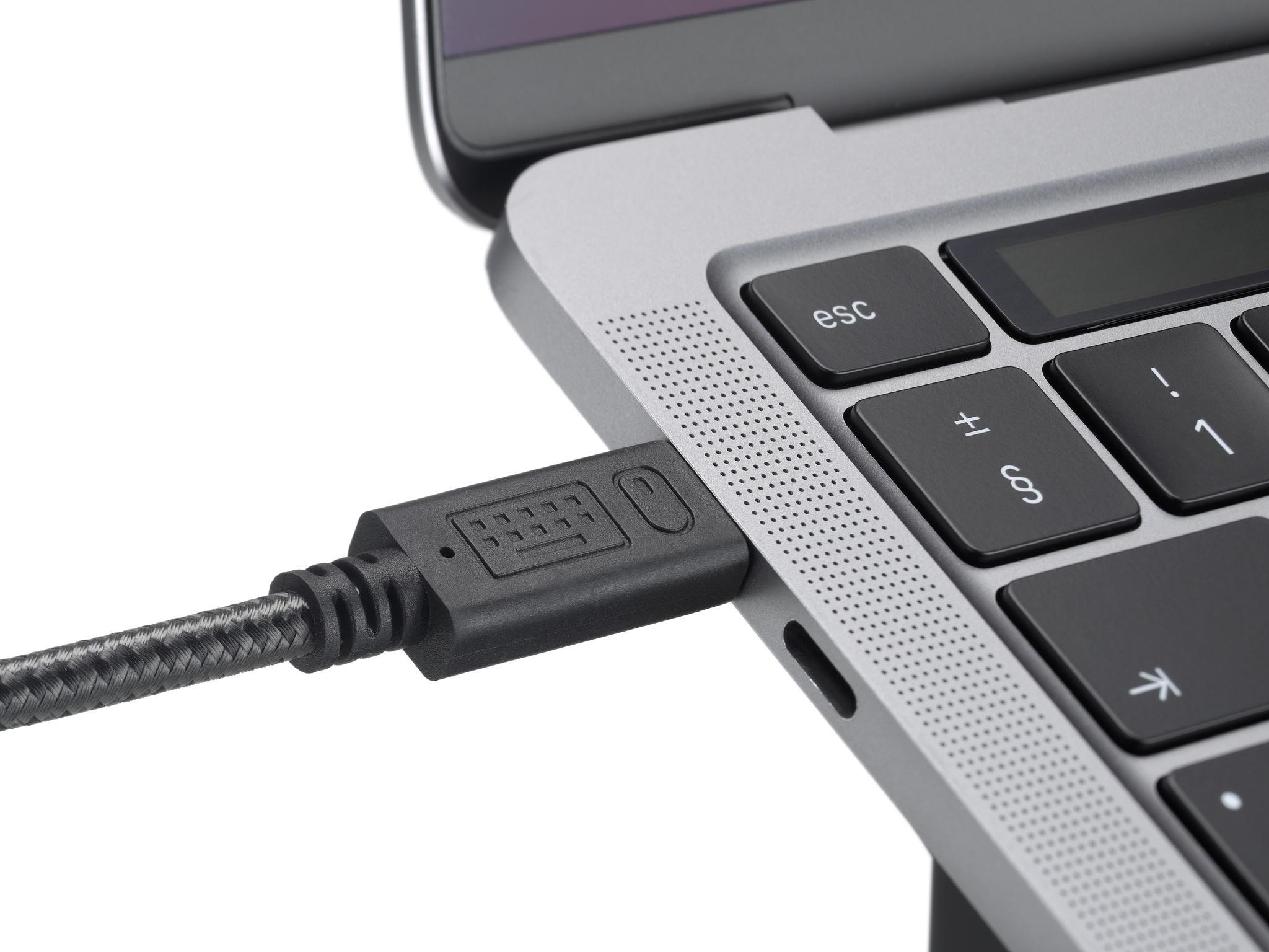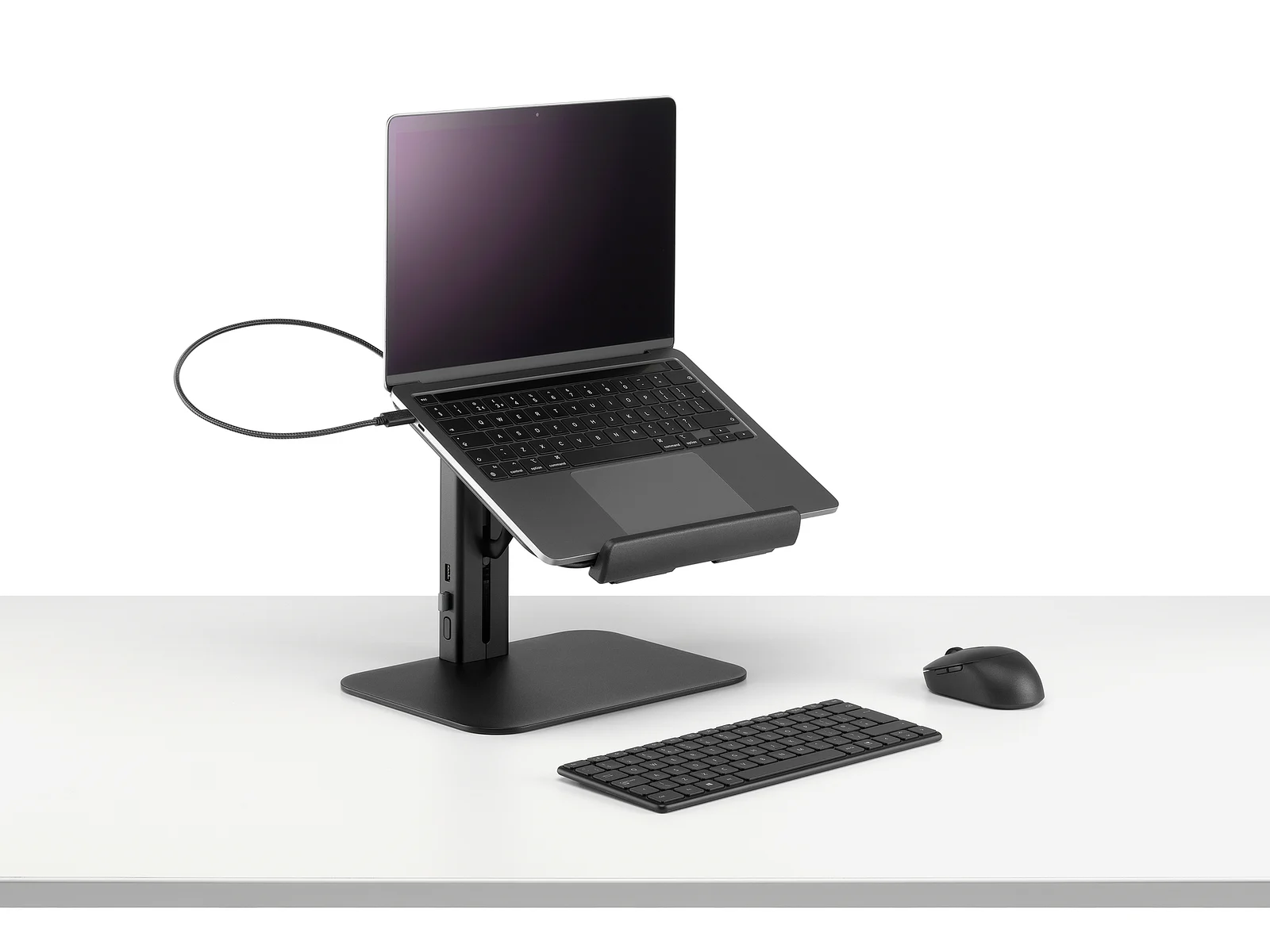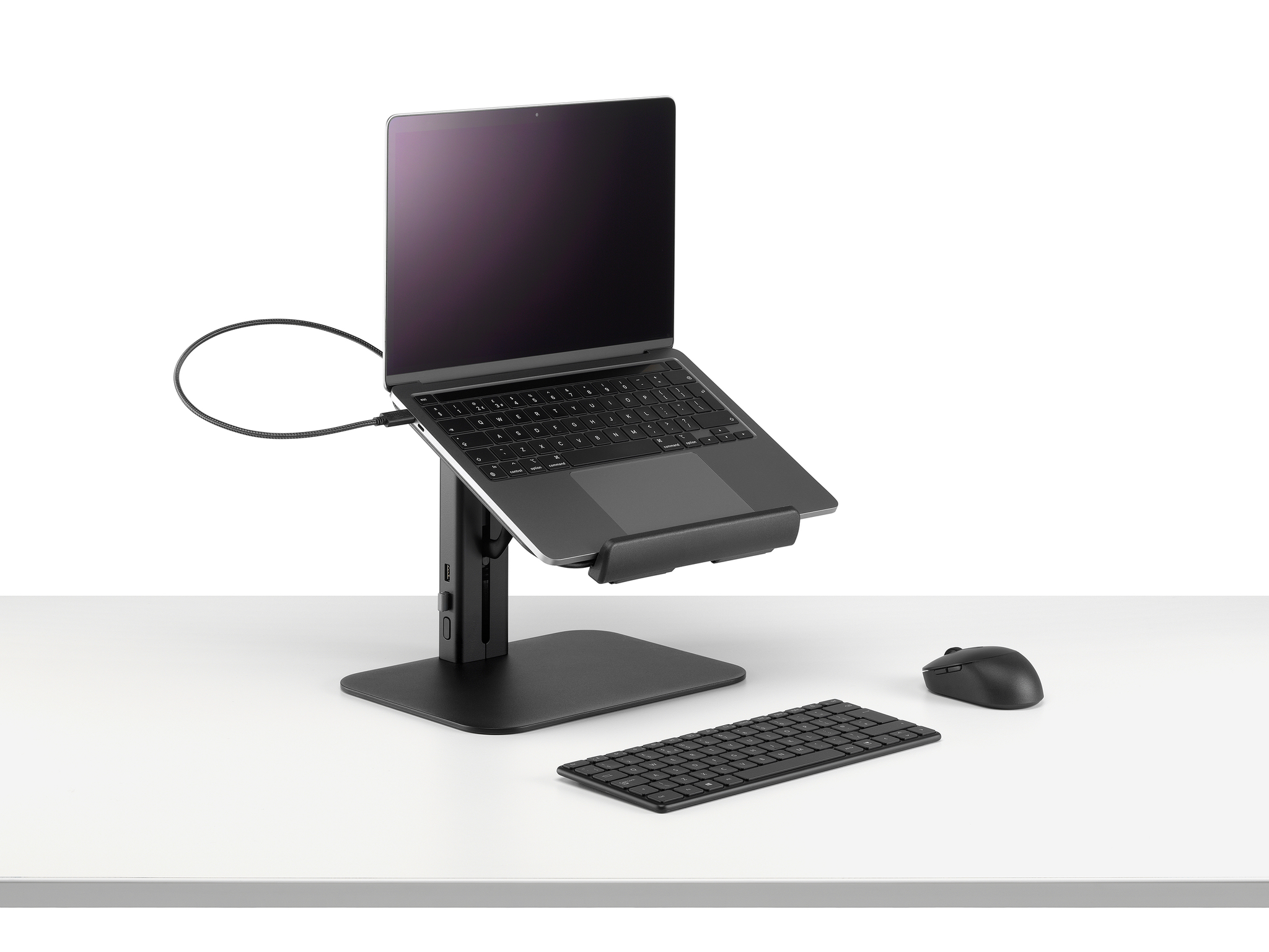 Stojan zároveň nabízí chytré vedení kabeláže – klávesnici, myš i napájení notebooku připojíte přes jediný kabel, který lze při nečinnosti elegantně skrýt pomocí integrovaného klipu pod pracovní plochou.