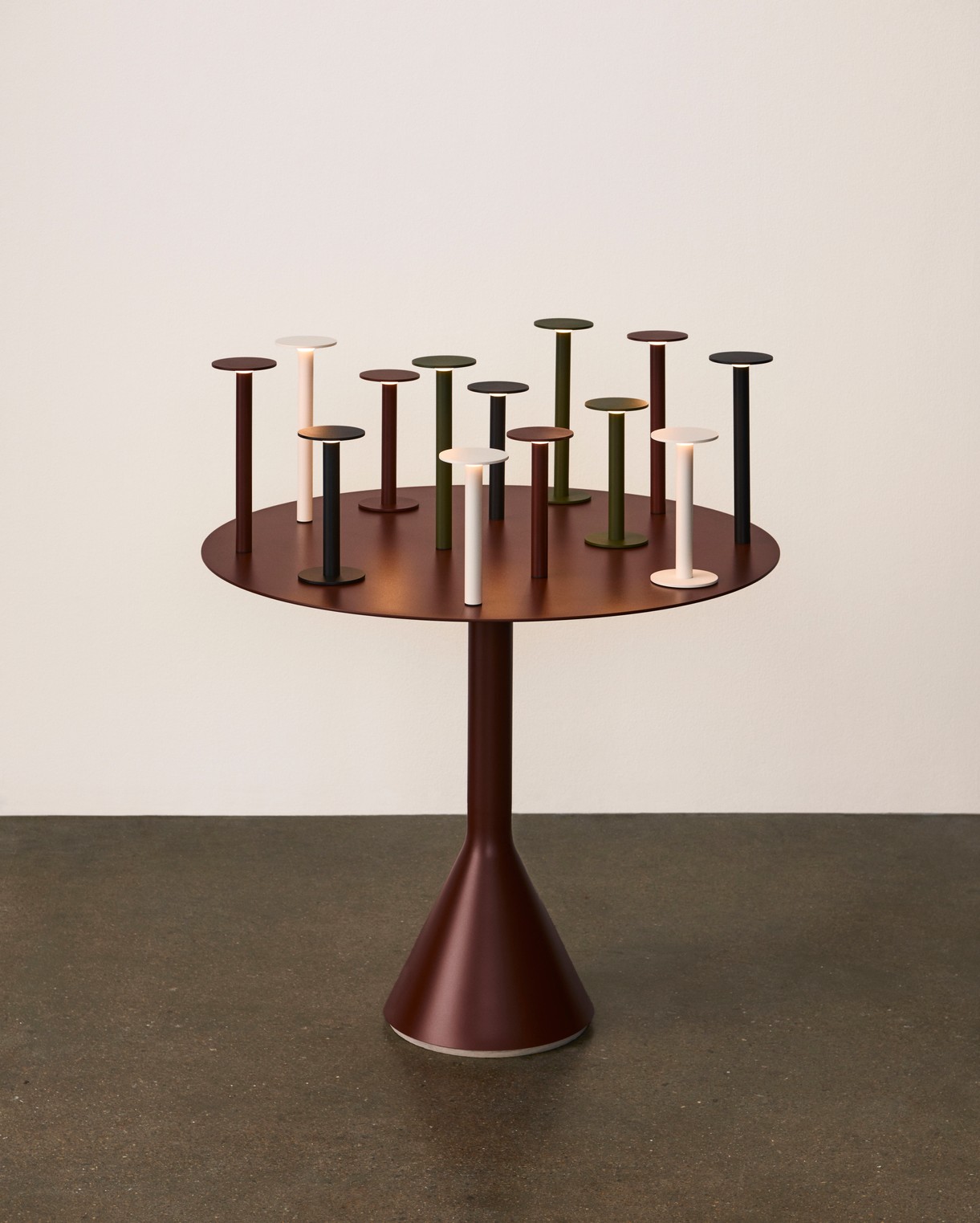 Štíhlý profil zabírá minimum místa, zatímco světlo směřující dolů jemně osvětluje povrch pod ním. Integrovaný magnet v základně umožňuje přichycení ke kovovým povrchům a pro použití na nemagnetických podkladech je součástí balení plochá ocelová základna. Je lehké a dobíjené přes USB-C, nabízí tak bezdrátovou flexibilitu a snadnou přenositelnost. Je k dispozici v různých výškách a barevných variantách, funguje stejně dobře samostatně i ve skupinách, takže se hodí jak do intimních prostředí, tak do sdílených prostor.