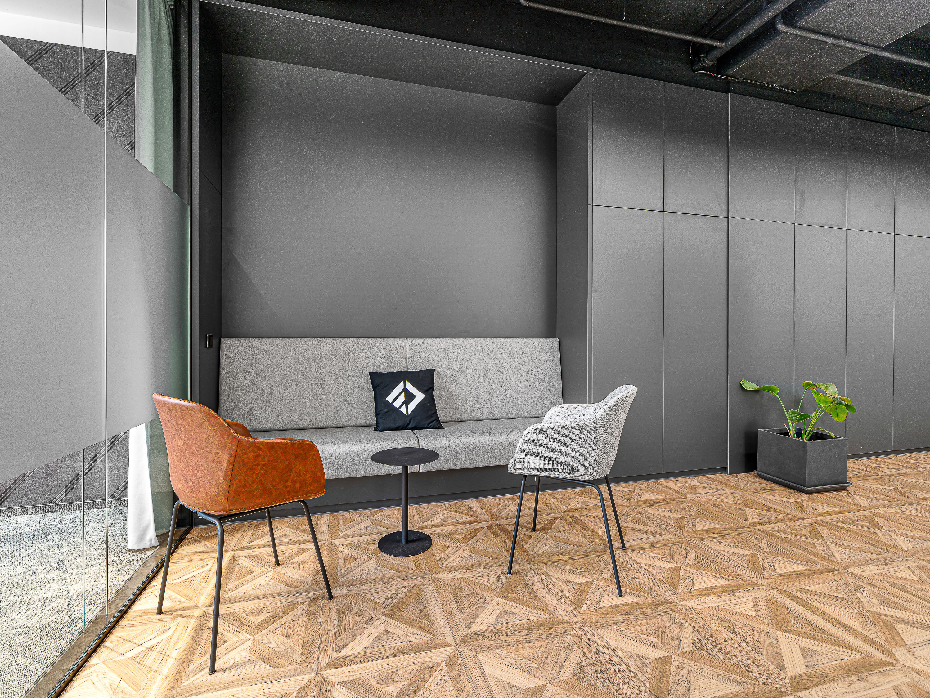 Pomohli jsme pracovní místa vybavit špičkovými výškově stavitelnými stoly HermanMiller v netradičním, ale elegantním celočerném provedení. Dodali jsme také prodyšné síťované jednací židle HermanMiller SETU. Akustickou pohodu v otevřeném kancelářském konceptu pomáhají řešit řešení od EchoJazz a smart budky Framery ONE COMPACT. Ačkoli jsou tyto budky jedny z nejmenších, překvapí svým chytrým vnitřním uspořádáním, které nakonec poskytuje více prostoru, než by člověk na první pohled řekl.