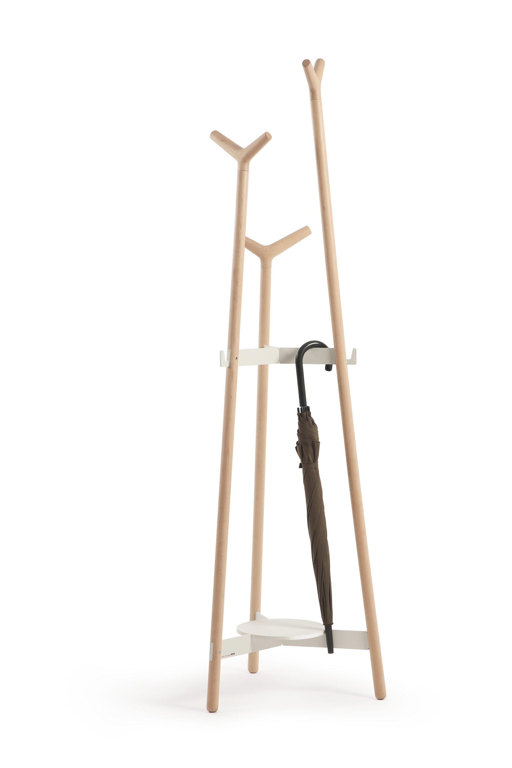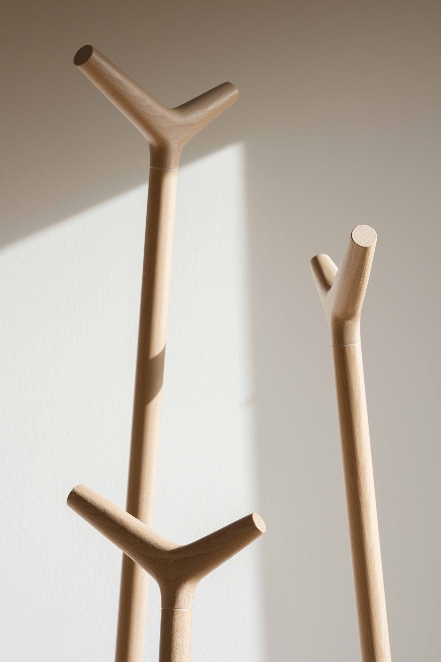 Formed by three turned bars of 32 mm diameter of three different heights: 176 cm, 157 cm, and 130 cm. This shape optimizes the capacity of the coat rack and provides comfort to the user. All elements are made of solid beech wood finished in water-based varnish.